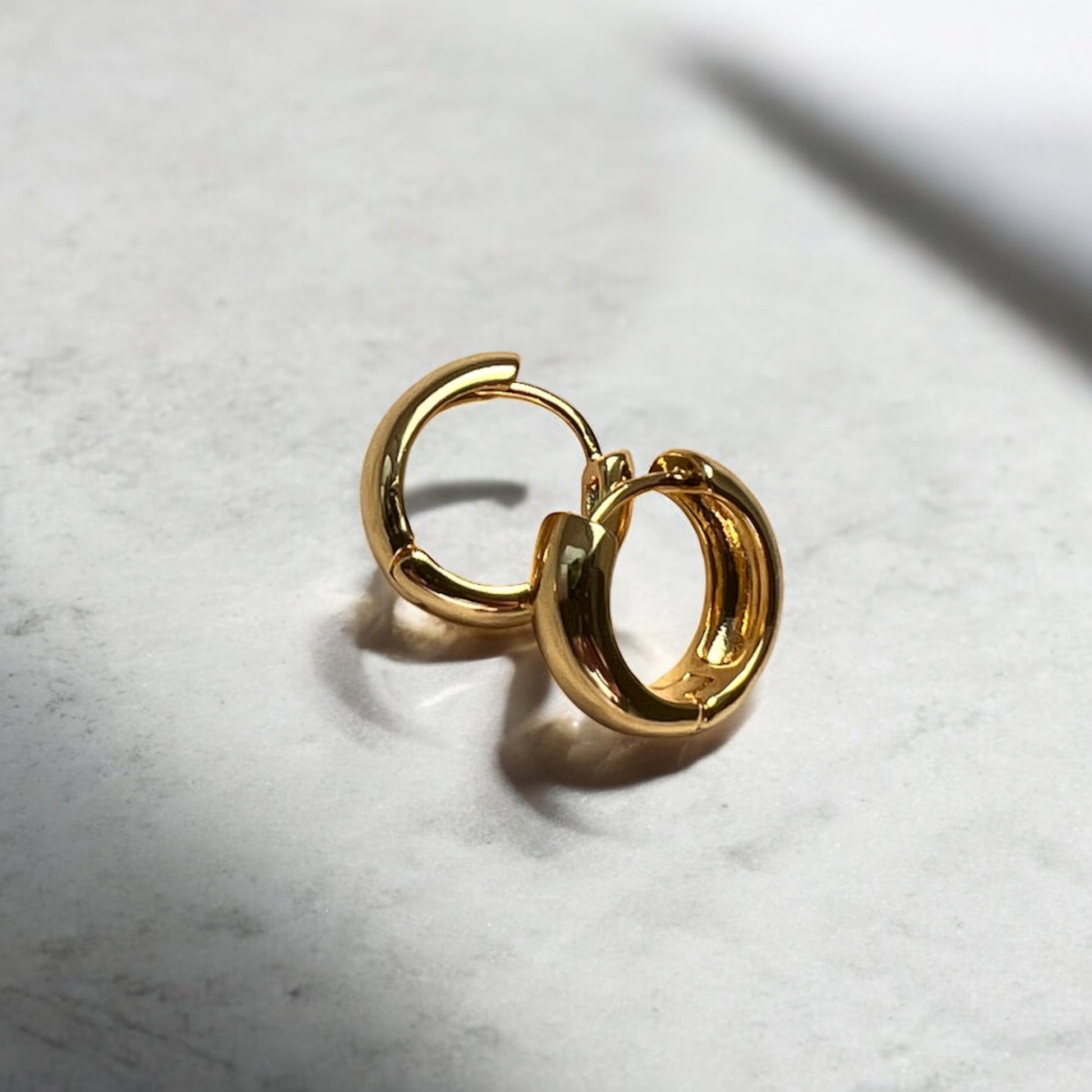 These 18ct gold plated 10mm huggie hoop earrings are hypoallergenic, comfortable, and perfect for everyday wear.